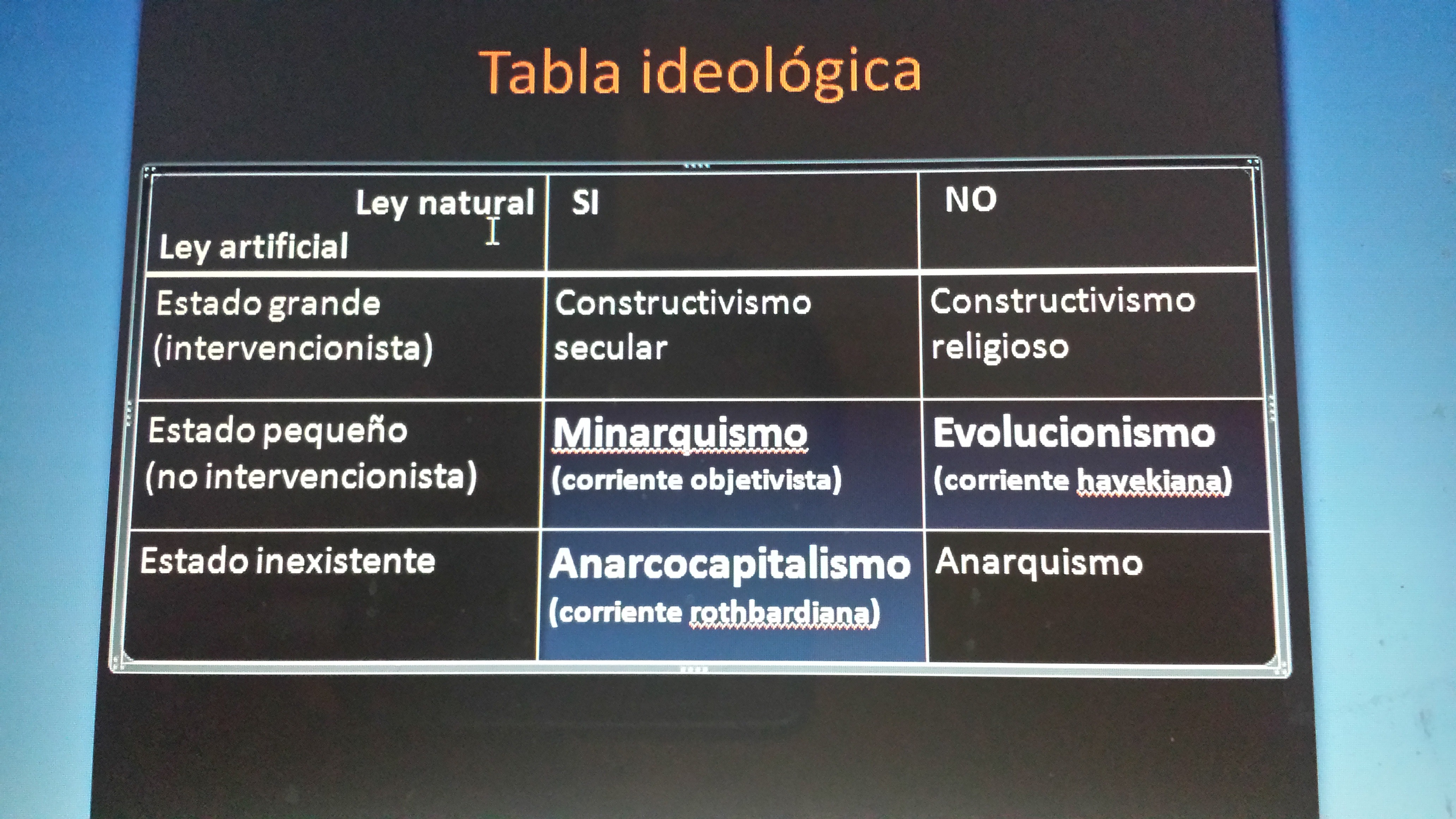 Por eso, si usamos los dos tipos de leyes que trata esa filosofía (Kosmos y taxis; ley natural y ley artificial), y los cruzamos utilizando una tabla, aparecen de inmediato todos los idearios que existen, y todos quedamos retratados. En general, todas las ideologías surgen de los problemas que enfrentan a aquellos que intentan definir y aplicar esos dos tipos de leyes (leyes naturales y leyes artificiales), enfrentamiento que acontece siempre en el cuadrilátero de la filosofía política. A continuación se expone esta tabla.