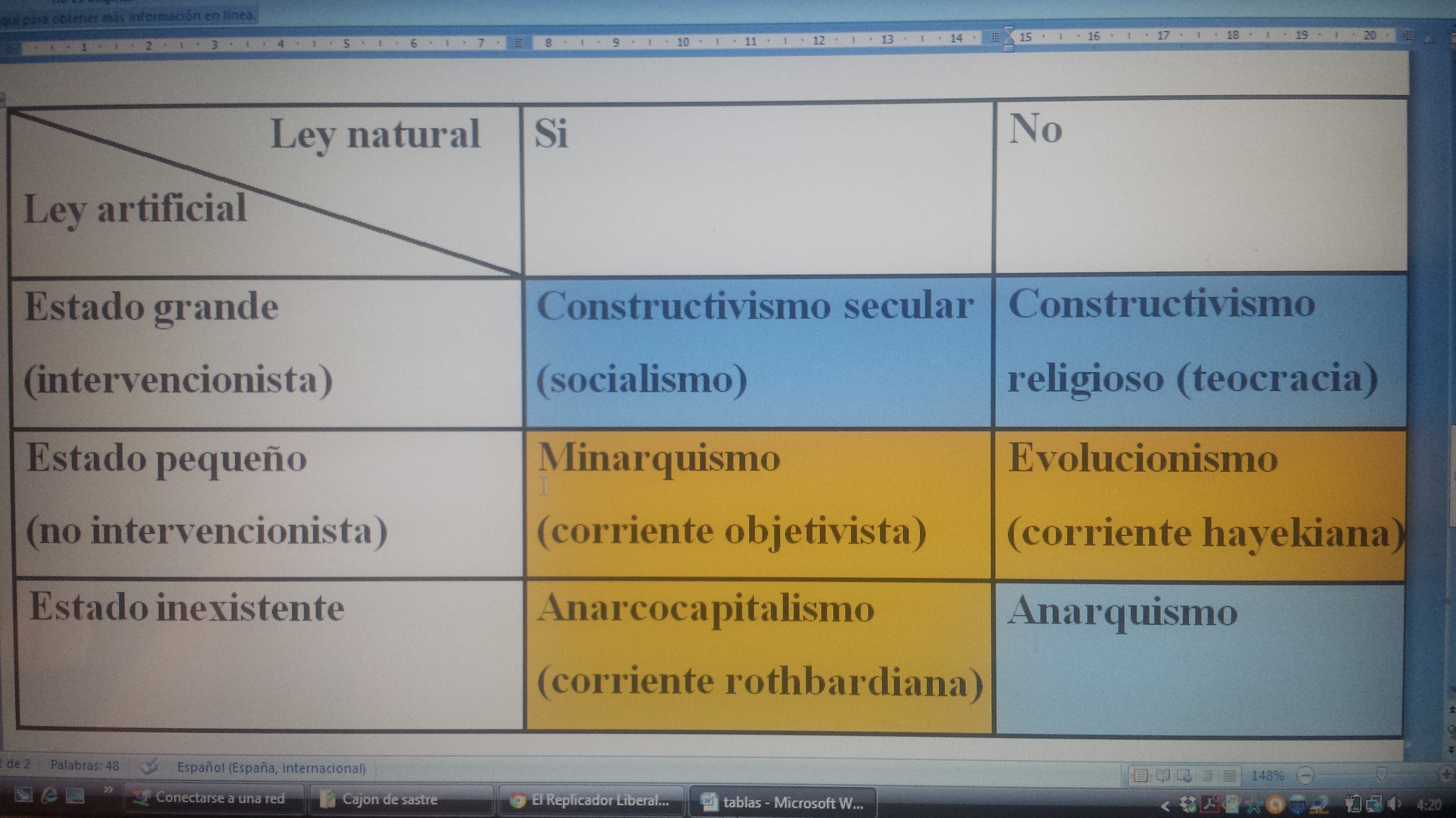 Estas nuevas interpretaciones del evolucionismo hayekiano obligan por tanto a expandir la tabla que presentamos al inicio de este artículo para poder apreciar todos los matices que distinguen a esas dos ideologías (anarquistas de mercado y evolucionistas hayekianos). El siguiente cuadro muestra claramente estas sutiles variaciones. Solo hace falta insistir en distinguir tres posiciones principales a la hora de considerar las leyes artificiales, los que creen en Estados grandes (intervencionistas), los que creen en Estados pequeños (minarquistas y evolucionistas) y los que no creen en absoluto en ningún Estado (anarcocapitalistas y anarquistas). Aclararemos también que, aunque tanto los constructivistas religiosos como los seculares requieren para sus hazañas de un Estado suficientemente grande y poderoso, esto es, de una ley artificial que acaba por anular y negar el núcleo esencial de la ley natural (la verdadera, la que se basa en la acción espontánea del individuo), los primeros acuden exclusivamente a leyes divinas que nada tienen que ver con la naturaleza y el funcionamiento físico de las cosas, mientras que los segundos sí que intentan apelar a ese funcionamiento, se autodenominan estudiosos de la naturaleza, aprueban la interpretación mecanicista del mundo, y justifican su postura recurriendo a unas fuerzas históricas y universales irrenunciables (la inevitable dialéctica de la historia y del materialismo, el milenarismo inexorable, y la llegada ineluctable de la victoria proletaria) que, a pesar de toda el aura mística que arrastran, pueden entenderse dentro del marco de otra ley natural, una que se opone radicalmente a la que defienden los liberales y los individualistas. Por eso, aunque en la primera tabla exponíamos indiferenciadamente a la teocracia y al socialismo (de uno o de otro modo todos son intervencionismos) y los representábamos juntos dentro de la misma casilla (la que quedaba fijada cuando se cruzaba la defensa de una ley artificial todopoderosa y el consecuente rechazo de la ley natural), ahora afinaremos más esa exégesis y convendremos en diferenciar dos tipos de constructivismo. Por un lado está la teocracia (constructivismo religioso), que no cree en sentido estricto en ninguna ley natural (física), pues basa toda su constitución en revelaciones divinas y reglas de carácter numinoso. Y por otro lado está el socialismo (constructivismo laico), que confía todas sus creencias y su normativa a unas leyes de la naturaleza erroneas. El socialismo utiliza la coacción generalizada y la ley estatal para arrumbar la ley natural que enraiza en la libertad del individuo. En ese sentido, deciamos que el socialismo rechaza el Kosmos y solo acepta la Taxis. Pero es necesario precisar ahora que ese rechazo no es hacia el Kosmos en sí, sino hacia esa ley natural que se basa en la soberanía incuestionable del individuo. En este otro sentido, el socialismo no reniega del Kosmos, sino que utiliza una ley natural equivocada (basada en la colectividad y no en la individualidad). Por eso ahora, en la nueva tabla, lo colocamos en una posición ligeramente distinta, a favor de la ley artificial, pero también a favor de una ley natural engañosa, que es la que viene a ratificar y corroborar el constructivismo secular, y la que deriva en esa defensa a ultranza del estatismo. Pero dejémonos ya de más explicaciones. Todas estas gamas ideológicas quedan mejor representadas en la tabla expandida que proponemos a continuación: